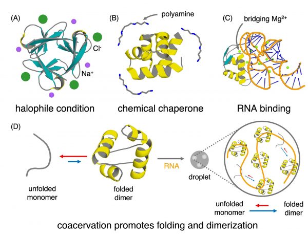 The first proteins may have emerged in chemically rich environments. These environments contain molecules like salts that stabilize protein structures, making early folding easier. Credit: Koh Seya, Alfie-Louise Brownless, Shina Caroline Lynn Kamerlin, and Liam M. Longo