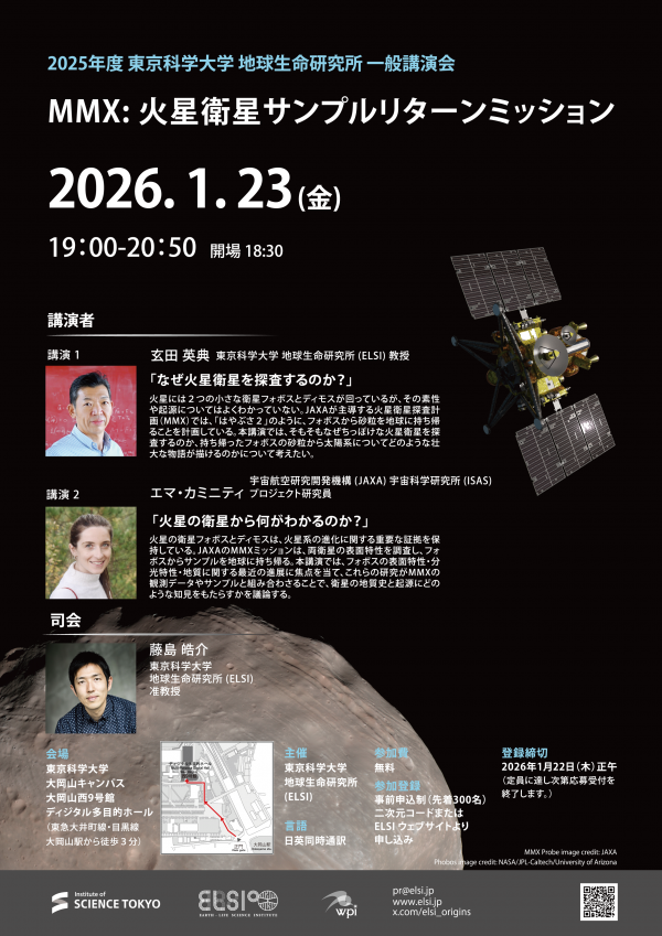 2026年1月23日(金)に東京科学大学 地球生命研究所 一般講演会を開催いたします。今年度は「MMX:火星衛星サンプルリターンミッション」をテーマに、ELSIの玄田英典教授と、JAXA/ISASのエマ・カミニティプロジェクト研究員が登壇します。講演1は日本語、講演2は英語で行われ、同時通訳が入ります。本イベントは会場開催のイベントで、ライブ配信はありません。
