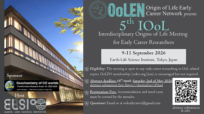 2026年9月9-11日に、第5回IOoL (若手研究者のための学際的生命起源研究会議) 2026 (IOoL26) が、東京科学大学 地球生命研究所 (ELSI)で開催されます。