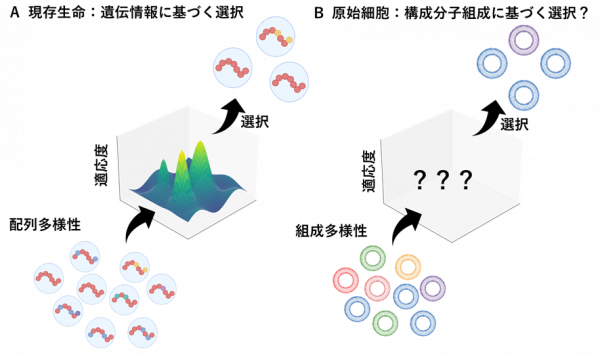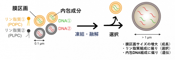 細胞の内部と外部を膜で隔てる区画構造は、生命の重要な特徴の一つです。そのため、生命誕生の初期段階には、既に膜区画構造を持つ原始細胞が存在したと考えられています[参考文献1]。しかし、現存の細胞の成長・分裂や遺伝情報の複製・継承といった、進化を担う機構は複雑なため、原始細胞がどのような機構で進化し、生命に至りえたのかは、極めて難しい問題です。