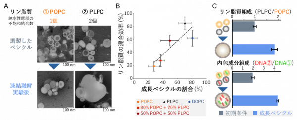そこで本研究では、疎水性尾部の構造が僅かに異なる3種類のリン脂質(POPC、PLPC、DOPC)を材料にして小さなベシクル(用語5)を作製し、凍結・融解が及ぼす影響を多角的・定量的に比較しました。その結果、凍結融解サイクルがリン脂質ベシクルのサイズの成長を引き起こすことに加え、成長効率がリン脂質の組成に大きく依存することを発見しました(図3A)。疎水性尾部に不飽和結合がより多い膜組成ほど、より高頻度でサイズが成長すると同時に、リン脂質や内包分子など構成成分の混合もより効率よく起きる傾向が示されました(図3B)。この相関関係は、凍結・融解で生じた成長ベシクルが、成長に有利な組成を引き継ぐ可能性を意味します。