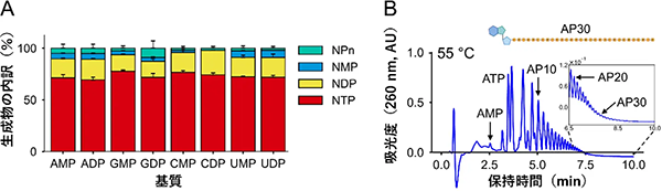 (A)ポリリン酸と、8種のNMPまたはNDPを基質とし、37℃で反応させた後の生成物の内訳。いずれの基質も、約70%はNTPに変換された。