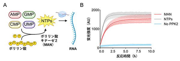 図2. MANによって生成したNTPを用いた細胞外転写反応の概略図(A)と、RNA生成量の経時変化(B)。